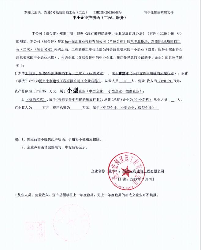 五、評審專家名單:宋偉、陸曉萍、陳玉龍 六、代理服務(wù)收費標(biāo)準(zhǔn)及金額:4200元收取 七、公告期限 自本公告發(fā)布之日起1個工作日。 八、其他補充事宜:無 九、凡對本次公告內(nèi)容提出詢問,請按以下方式聯(lián)系。 1.采購人信息 名 稱:揚州錦匯置業(yè)投資有限公司 地 址:揚州市 聯(lián)系方式:0514-82120352 2.采購代理機構(gòu)信息 名 稱:江蘇匯誠投資咨詢管理有限公司 地 址:揚州市邗江北路68號3樓 聯(lián) 系 人:張靜 聯(lián)系電話:18752727498 3.項目聯(lián)系方式 項目聯(lián)系人:張靜 電 話:18752727498 2023年7月7日 中小企業(yè)聲明函.jpg