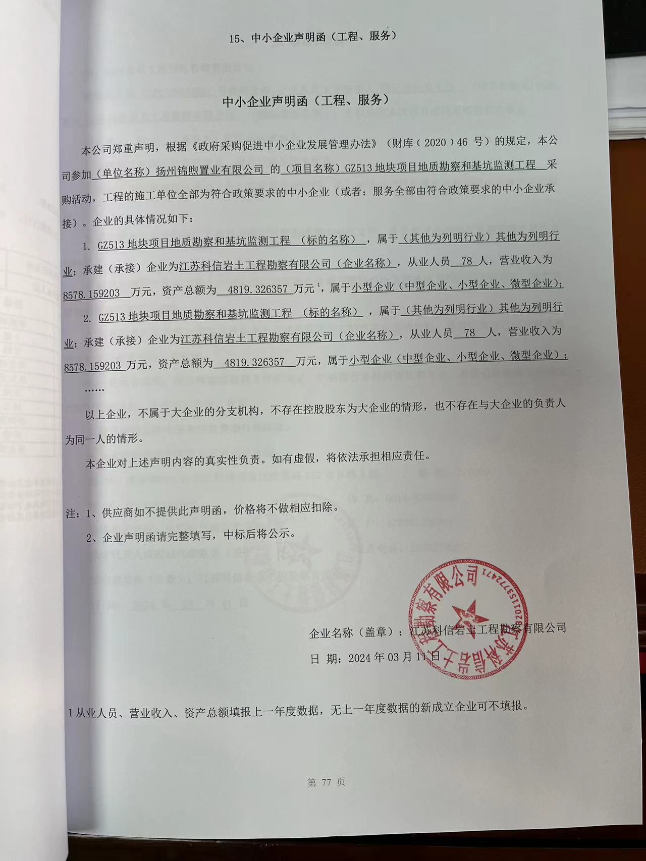 五、評審專家名單:謝輝、黃春華、宋建輝 六、公告期限 自本公告發(fā)布之日起1個工作日。 七、其他補充事宜 無 八、凡對本次公告內(nèi)容提出詢問,請按以下方式聯(lián)系。 1.采購人信息 名 稱:揚州錦煦置業(yè)有限公司 2.采購代理機構(gòu)信息 名 稱:揚州筑苑工程招標(biāo)咨詢有限公司 地 址:揚州潤揚北路19號 聯(lián) 系 人:李斌 聯(lián)系電話:0514-87116778 3.項目聯(lián)系方式 項目聯(lián)系人:李斌 電 話:0514-87116778 揚州筑苑工程招標(biāo)咨詢有限公司 2024年3月12日 中小企業(yè)聲明函.jpg