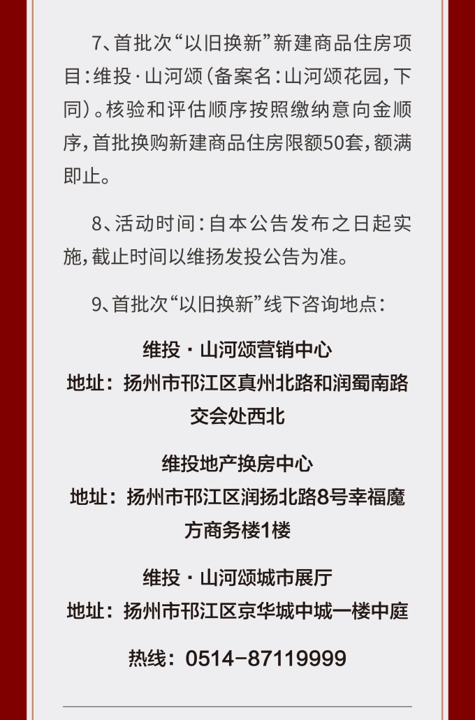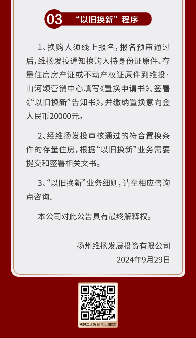 住房“以舊換新”“以房換房”是各地房地產(chǎn)新政中以“小細節(jié)”撬動“大市場”的重要舉措。維揚發(fā)投積極響應政府新推行的“以舊換新”政策,踐行“惠民”理念,整合各項資源,搭建換房中心平臺,為買房人提供一站式以舊換新置換服務,推動激活邗江區(qū)商品房市場活力。 此次維揚發(fā)投“以舊換新”工作以其自主開發(fā)的維投·山河頌項目為試點,由國企背書、置換范圍廣、全流程專業(yè)服務。首批換購新建商品住房限額50套,換購人可通過登錄“維揚發(fā)投商品住房‘以舊換新’線上報名系統(tǒng)”報名,具體要求詳見公告。