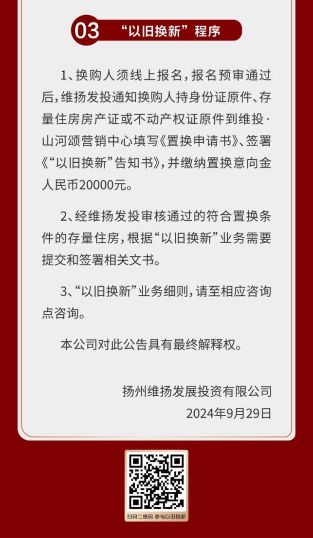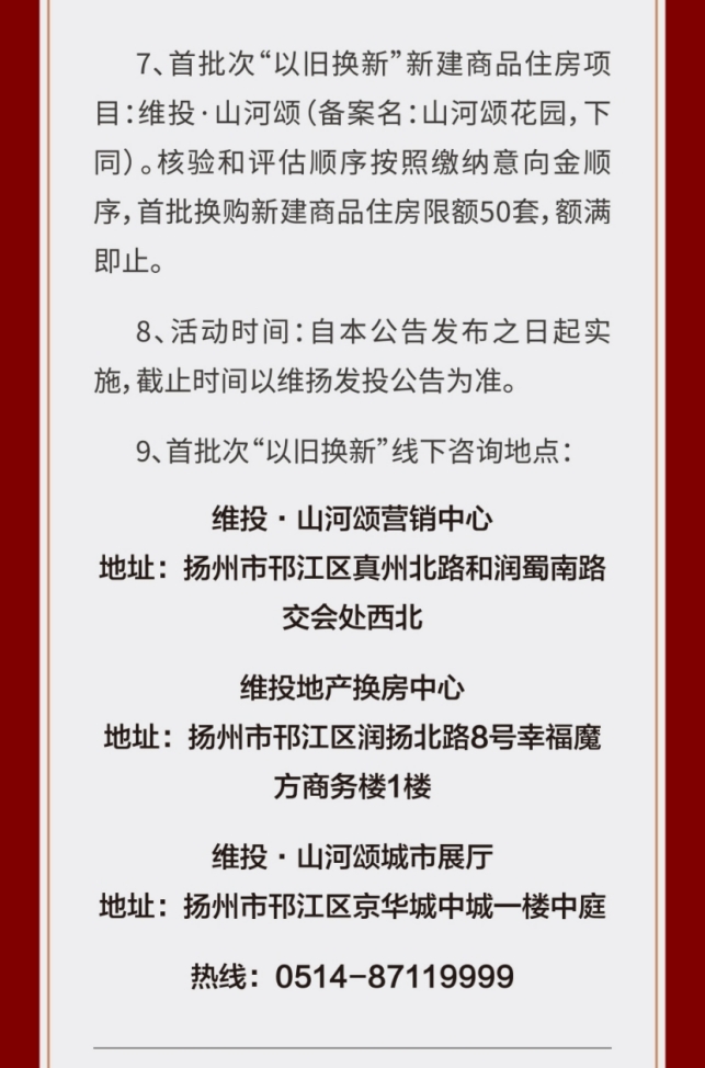 作為國企,維揚發(fā)投積極響應(yīng)政府新推行的“以舊換新”政策,此次以其自主開發(fā)的維投·山河頌項目為試點,由國企背書、置換范圍廣、全流程專業(yè)服務(wù)。自公布“以舊換新”消息以來,維投地產(chǎn)線下三個“以舊換新”咨詢地點人氣持續(xù)爆棚!前來咨詢的購房者絡(luò)繹不絕。維投地產(chǎn)在開盤前就擺出誠意,給足買房人信心。通過“以舊換新”,買房人可以直接置換明月湖畔聯(lián)排別墅,改善一步到位!目前首批推出的換購新建商品住房限額50套“以舊換新”登記即將接近尾聲,感興趣的買房人抓緊時間辦理申請。